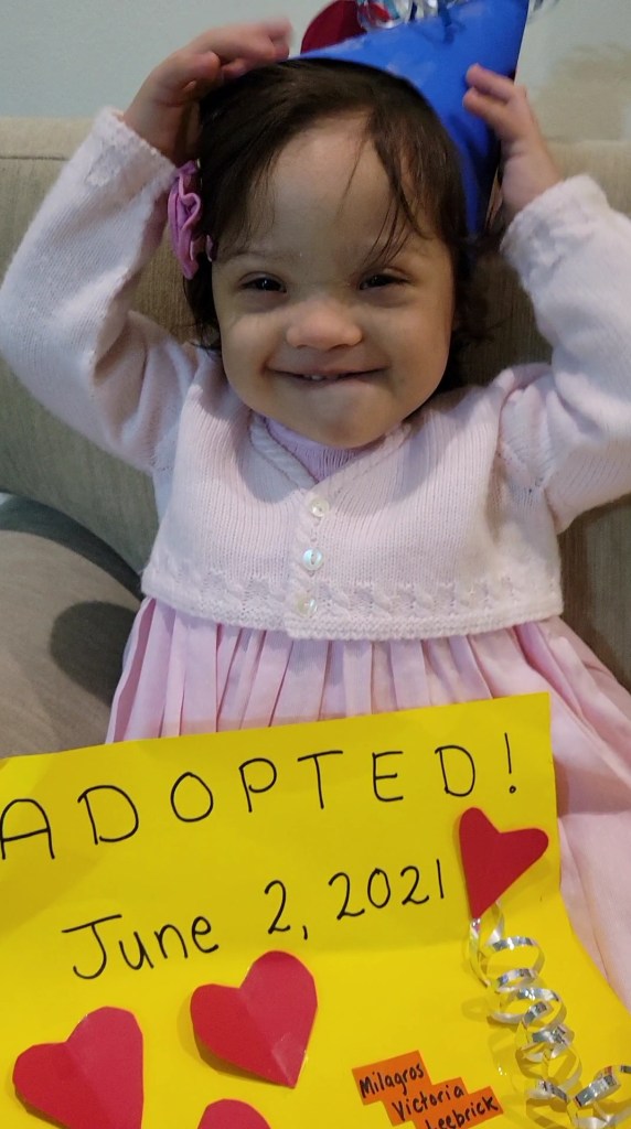 Mila is four years old and attends a wonderful preschool classroom. She loves going to school and has the best teachers and friends there. She is still learning ASL, but we are also working with a speech therapist to get a communication device as she has so much she wants to communicate and can’t. Some of her favorite things to do are ride her ziggle, run fast, go to the park, swim, and do anything active. She is very sociable and is thrilled when she has her brothers, friends, or even strangers to play with. She greets almost everyone she encounters and loves when people respond. She has name signs for family members, and often she signs the name of someone who isn’t with her and then signs “wait” meaning she’s eager to see them again. It’s sweet to see how much she thinks about and wants to be with her family. She and Allen have a special bond, and she signs his name by putting the letter “a” across her chest and verbalizes by calling him “Ah, Ah.” His name is usually her first word every morning as she wakes up and asks where he is. She and Allen love to play with stuffed animals, run from dinosaurs, or create pirate booby traps. What fun!