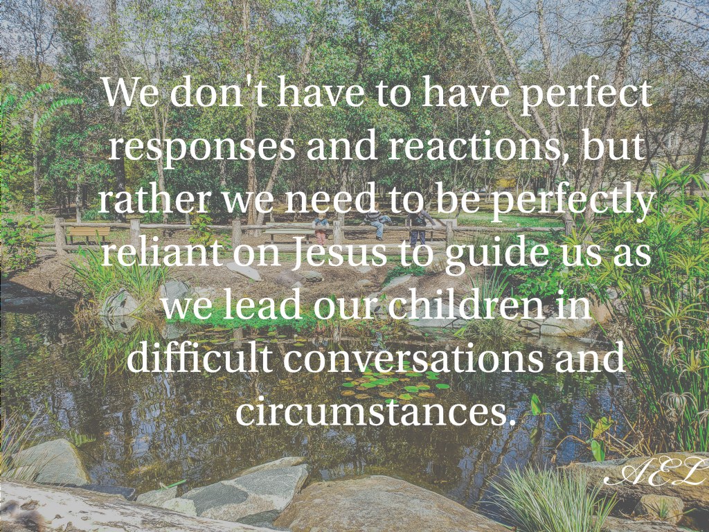 A full measure of grace is needed in parenting. God gives grace to us, and we show grace to our children. But probably the hardest one for us is to give grace to ourselves. God knows we aren’t perfect, and He loves us anyway. We have to accept that. There is no good outcome for us or our children when we expect perfection as we parent. In fact, it’s in our weakness that our children learn how to handle their own weaknesses.